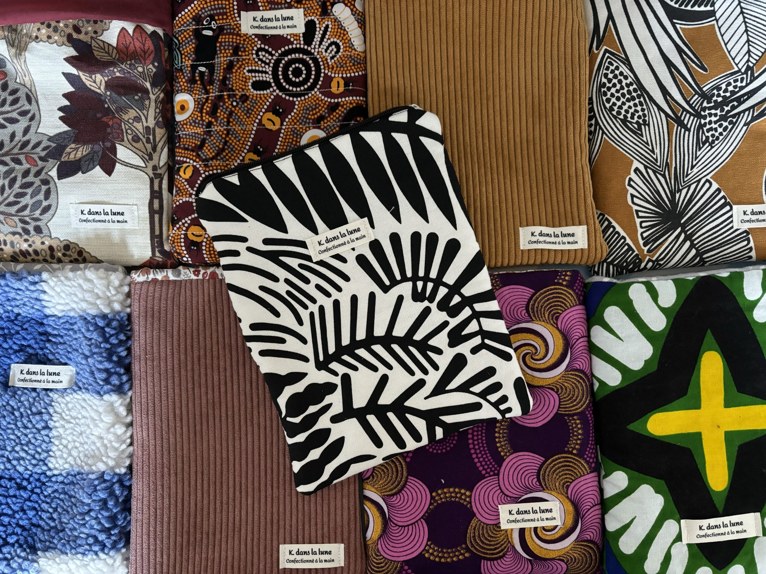 | Tissu | Jean vert et fleurs sur fond blanc, Petites fleurs fond bleu marine/ ocre sur fond blanc, sherpa carreaux bleus et blancs, velours ocre, velours rose et petites fleurs, wax rose et violet, Wax vert |